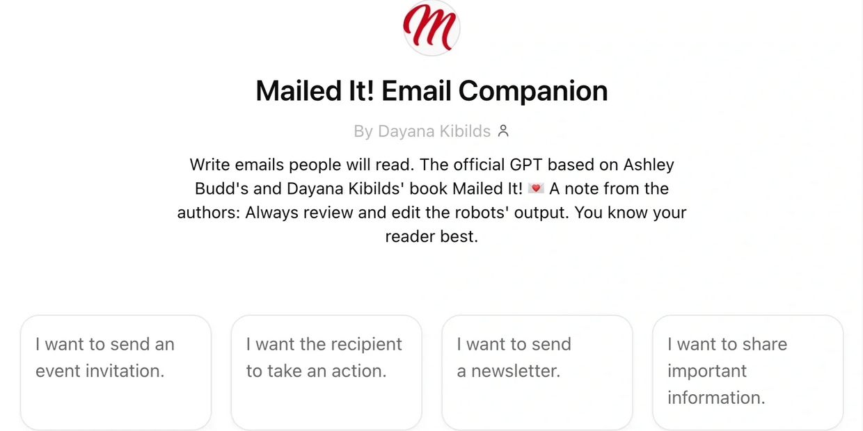 The Mailed It! Email Companion is trained with specific instructions from our book, including subject lines that summarize the email, simplified language, optimal link and button text, and the most popular reading patterns. It’s better than an untrained AI tool, but it’s not perfect. If you’re not getting results you like, start over. And always edit and review — you know your reader best.